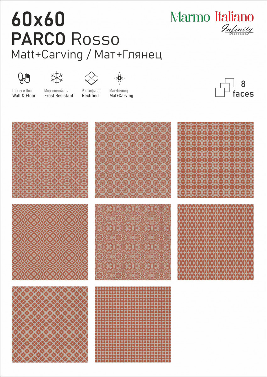 Керамогранит 60x60 9мм матовая Parco Rosso Carving универсальная Infinity Ceramica