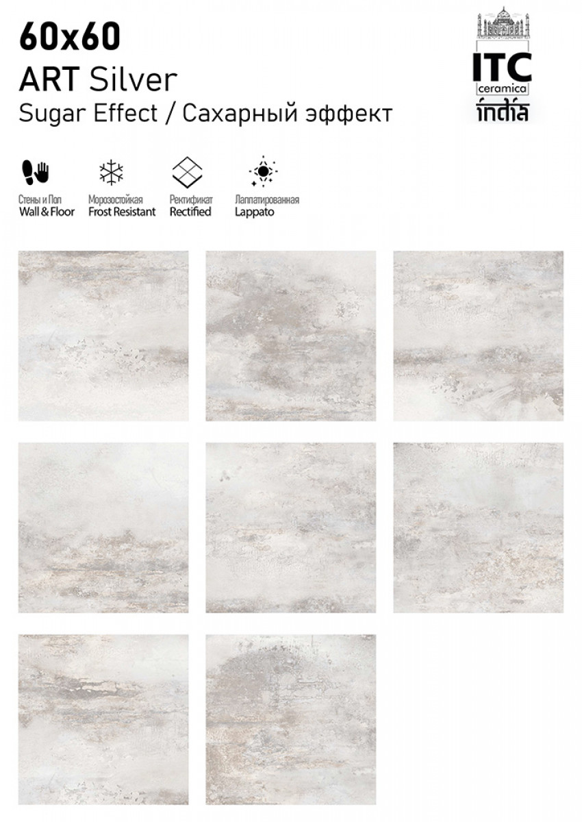 Керамогранит 60x60 8.7мм матовая Art Silver Sugar универсальная ITC India
