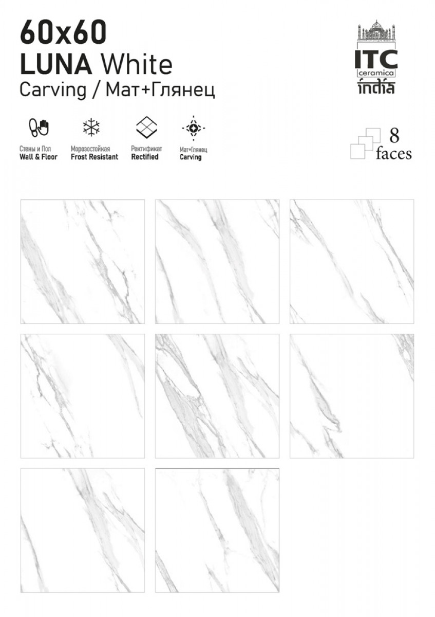 Керамогранит 60x60 8.7мм матовая Luna White Carving универсальная ITC India